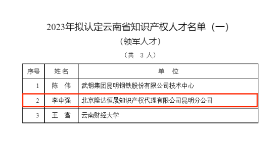 2023年拟认定云南省知识产权人才名单(一)(领军人才)(共3人) 2023年拟认定云南省知识产权人才名单(二)(高层次人才)(共5人) 2023年拟认定云南省知识产权人才名单(三)(实务人才)(共65人) 隆达知产-人才简介 李中强 隆达知识产权总经理|法学硕士 资深专利代理师、高级科技咨询师、广东知识产权保护协会专家库专家、楚雄高新区知识产权特派员、云南省市场监督管理局专家库专家、知识产权纠纷兼职人民调解员、国家知识产权运营公共服务平台实务指导专家、中国小微企业双创服务高级人才...... 吕娅维 隆达知识产权项目专员 硕士研究生 科技咨询师 中级技术经纪人 专利分析专业人员 ...... 完 扫码关注我们 隆达知产 获取更多精彩资讯