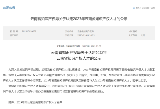 云南省知识产权局发布公示