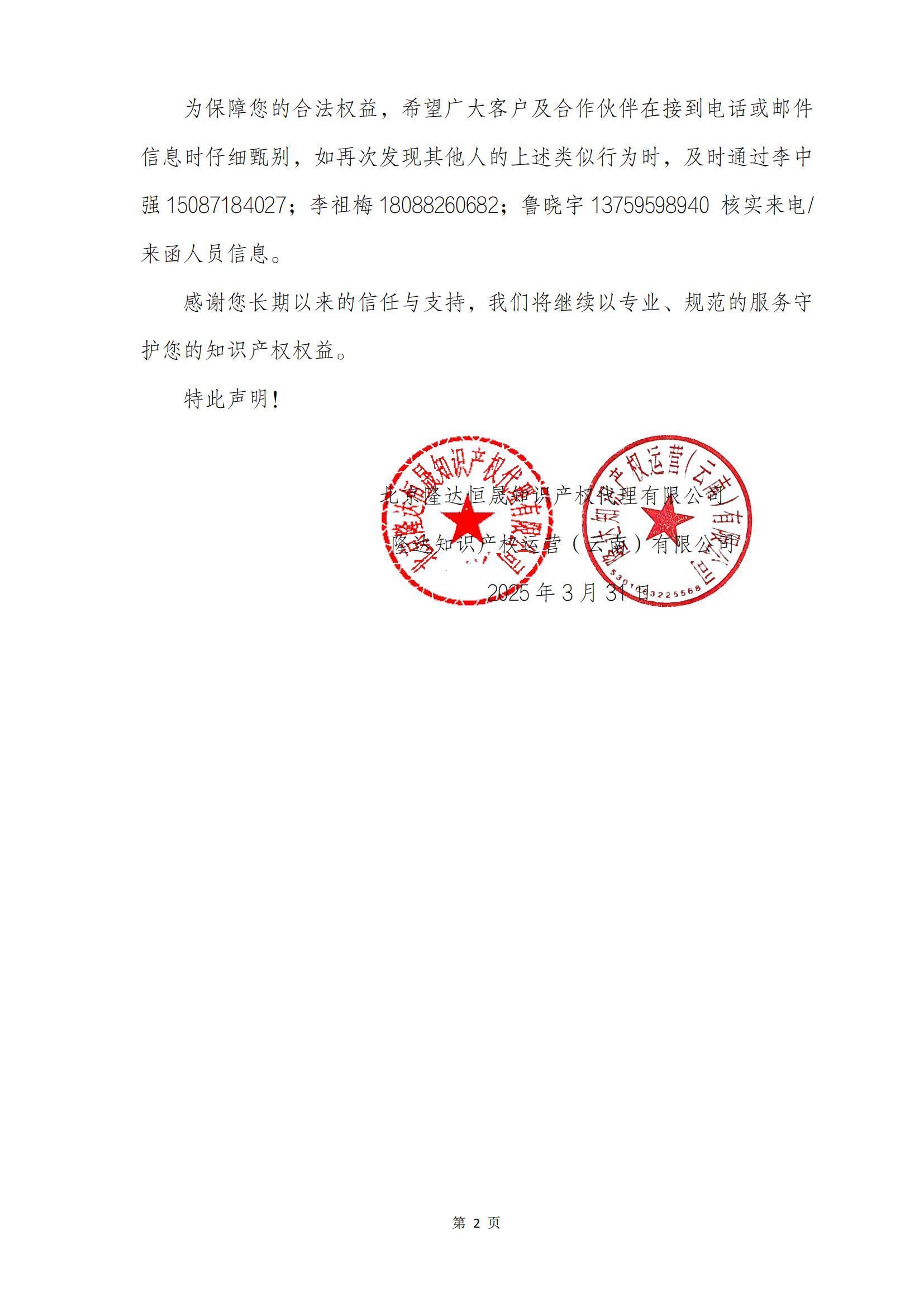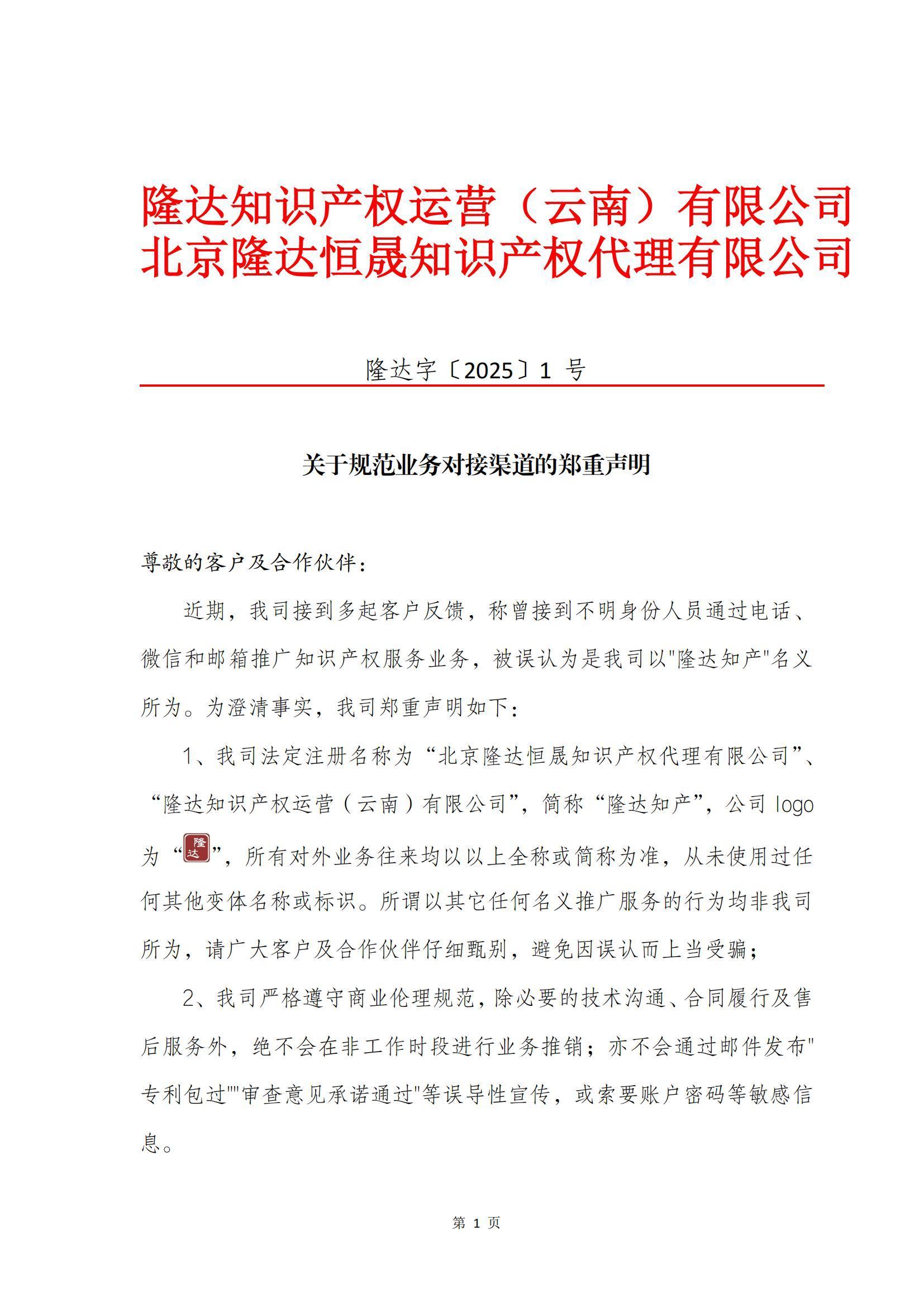 发布于 2025-04-08 11:40分类: 公司动态来源: 隆达知产尊敬的客户及合作伙伴: 近期,我司接到多起客户反馈,称曾接到不明身份人员通过电话、微信和邮箱推广知识产权服务业务,被误认为是我司以"隆达知产"名义所为。为澄清事实,我司郑重声明如下,请广大客户及合作伙伴仔细甄别,避免因误认而上当受骗。感谢您长期以来的信任与支持,我们将继续以专业、规范的服务守护您的知识产权权益!