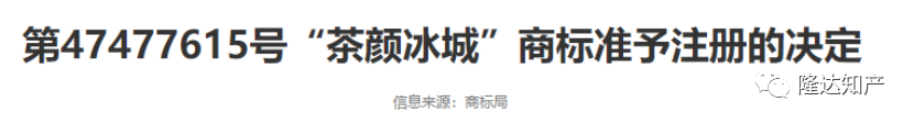 如下图所示,“温燕子”同学在29类、30类、42类、43类申请了“茶颜冰城”,嘲讽值直接拉满,引来了蜜雪冰城和茶颜悦色两大品牌的联手异议。“茶颜”+“冰城”,注册的商品也是奶茶中常见商品。 第47477615号“茶颜冰城”商标指定使用商品为第30类“冰茶;茶饮料;冰淇淋;咖啡饮料;果汁刨冰;加奶咖啡饮料;茶;咖啡;用作茶叶代用品的花或叶;黄色糖浆”等。 第47468746号“茶颜冰城”商标指定使用商品为第32类“无酒精果汁;无酒精果汁饮料;果汁;蔬菜汁(饮料);带果肉果汁饮料;咖啡味非酒精饮料;茶味非酒精饮料;蒸馏水(饮料);制作饮料用无酒精原汁;果汁冰水(饮料)”等,直接涉及到了核心业务,怪不得两大品牌会共同提出了异议。 目前,中国商标网已经公开了以上两件“茶颜冰城”商标的异议决定书,最终决定都是准予注册。我们以第47477615号“茶颜冰城”商标为例看一下:被异议商标基本情况:第47477615号“茶颜冰城”指定使用商品为第30类“冰茶;茶饮料;冰淇淋;咖啡饮料;果汁刨冰;加奶咖啡饮料;茶;咖啡;用作茶叶代用品的花或叶;黄色浆”等。 第一异议人引证商标为第15335343号、第24287336号“茶颜悦色”等商标核定使用在第30类“咖啡饮料;茶饮料”等商品上。 商标局认为虽然双方商标指定使用的部分商品为同一种或类似商品,但被异议商标与第一异议人引证商标在文字构成、呼叫、外观等方面差异明显,因此双方商标未构成指定使用于同一种或类似商品上的近似商标。